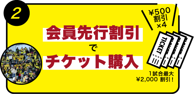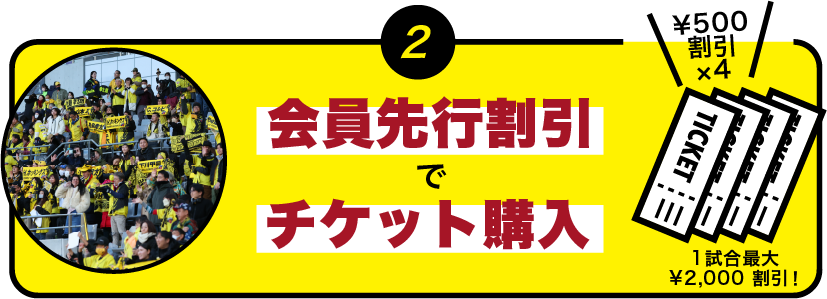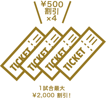 前売価格から500円引きで試合チケットを購入可能!1試合4枚まで割引価格で購入いただけるため、最大で2,000円もお得に!